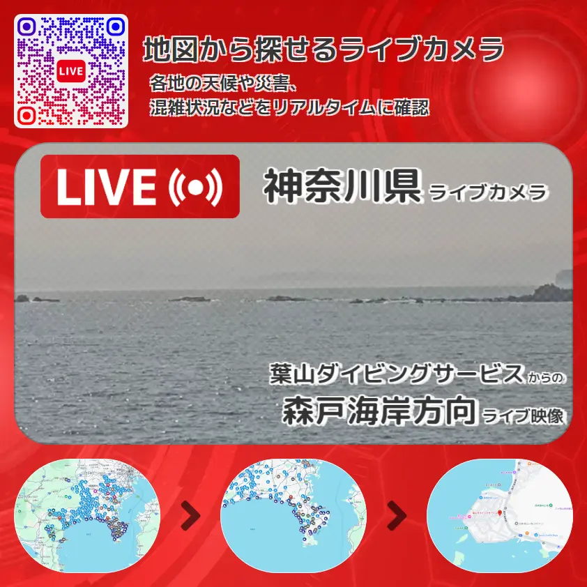 森戸海岸方向の他に、芝崎一色海岸方向や周辺の気象状況も併せてチェックすることが可能で、台風・大雨・地震などの災害による被害状況も把握することができます。