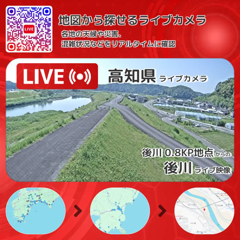 後川の他に、後川四万十川合流地点方面や周辺の気象状況も併せてチェックすることが可能で、台風・大雨・地震などの災害による被害状況も把握することができます。