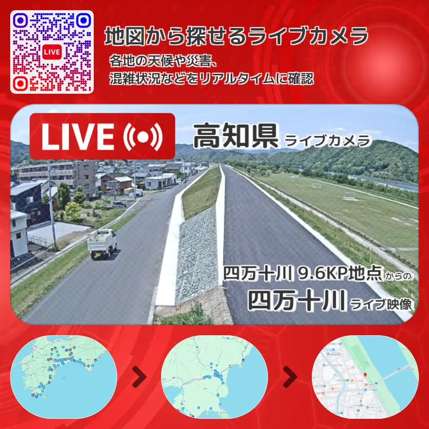 四万十川の他に、渡川緑地や周辺の気象状況も併せてチェックすることが可能で、台風・大雨・地震などの災害による被害状況も把握することができます。