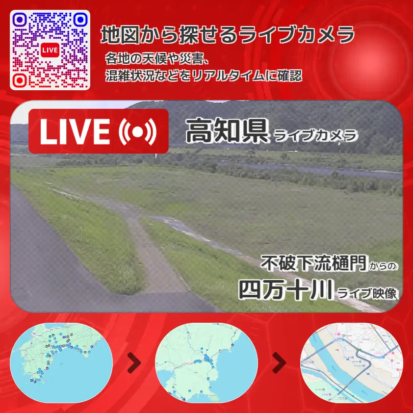四万十川の他に、新四万十川橋や周辺の気象状況も併せてチェックすることが可能で、台風・大雨・地震などの災害による被害状況も把握することができます。