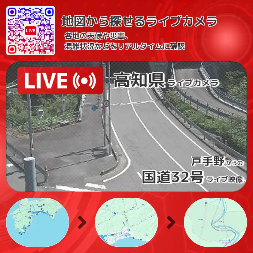 国道32号の他に、戸手野トンネルや周辺の気象状況も併せてチェックすることが可能で、台風・大雨・地震などの災害による被害状況も把握することができます。
