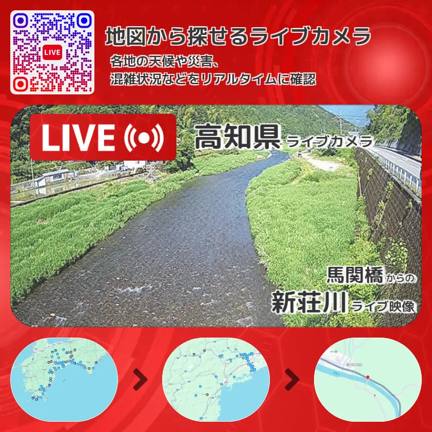 新荘川の他に、国道197号や周辺の気象状況も併せてチェックすることが可能で、台風・大雨・地震などの災害による被害状況も把握することができます。