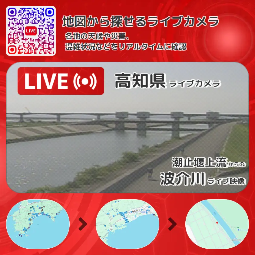 周辺の気象状況も併せてチェックすることが可能で、台風・大雨・地震などの災害による被害状況も把握することができます。