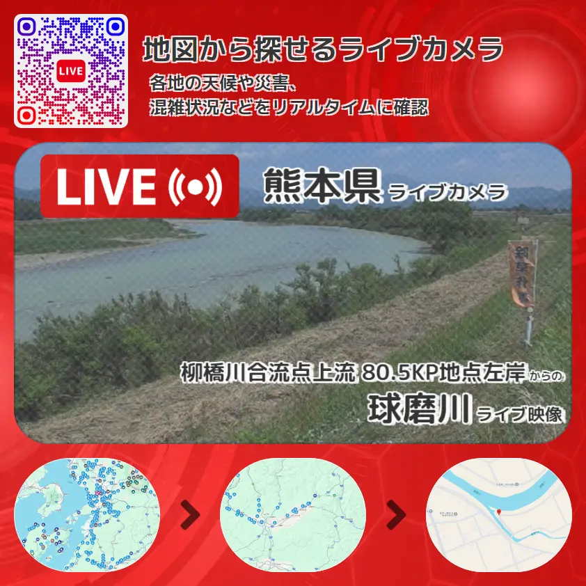 球磨川の他に、柳橋川や周辺の気象状況も併せてチェックすることが可能で、台風・大雨・地震などの災害による被害状況も把握することができます。