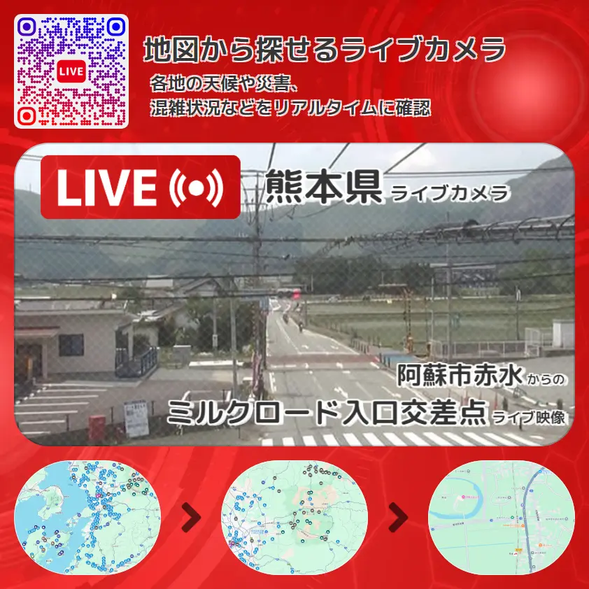ミルクロード入口交差点の他に、熊本県道23号菊池赤水線や周辺の気象状況も併せてチェックすることが可能で、台風・大雨・地震などの災害による被害状況も把握することができます。