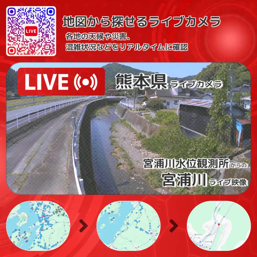 宮浦川の他に、熊本県道60号芦北坂本線や周辺の気象状況も併せてチェックすることが可能で、台風・大雨・地震などの災害による被害状況も把握することができます。
