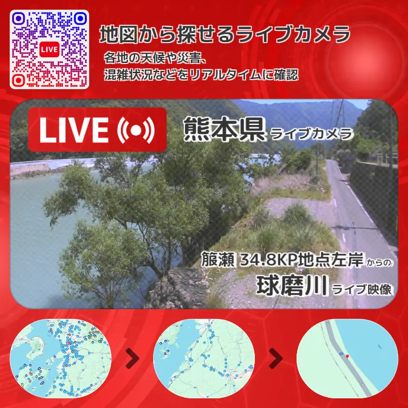 球磨川の他に、熊本県道272号球磨田浦線や周辺の気象状況も併せてチェックすることが可能で、台風・大雨・地震などの災害による被害状況も把握することができます。