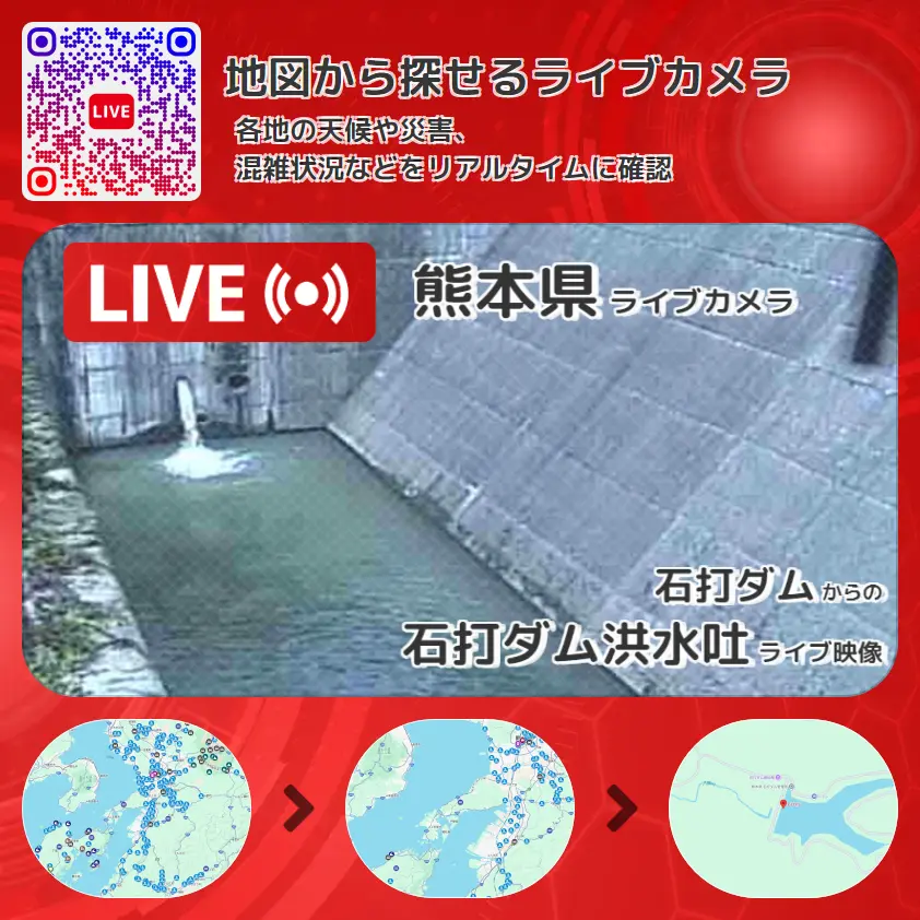 周辺の気象状況も併せてチェックすることが可能で、台風・大雨・地震などの災害による被害状況も把握することができます。
