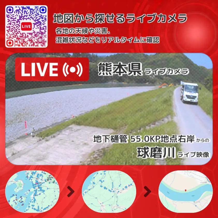 球磨川の他に、沖鶴橋や周辺の気象状況も併せてチェックすることが可能で、台風・大雨・地震などの災害による被害状況も把握することができます。