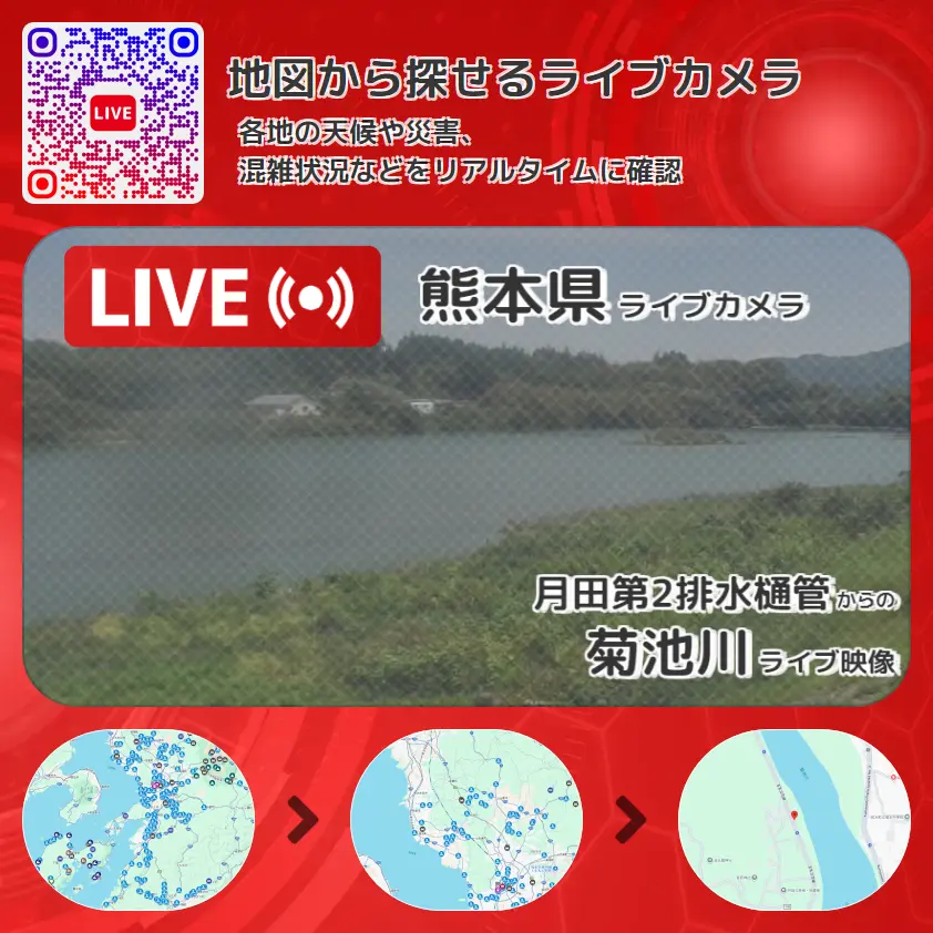 周辺の気象状況も併せてチェックすることが可能で、台風・大雨・地震などの災害による被害状況も把握することができます。