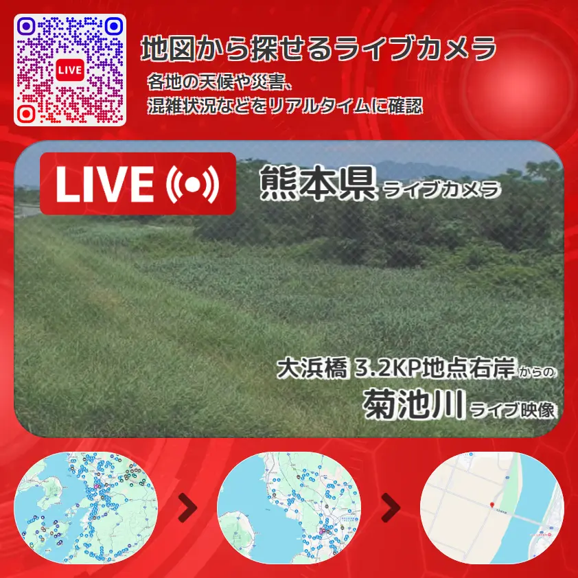 菊池川の他に、大浜橋付近や周辺の気象状況も併せてチェックすることが可能で、台風・大雨・地震などの災害による被害状況も把握することができます。