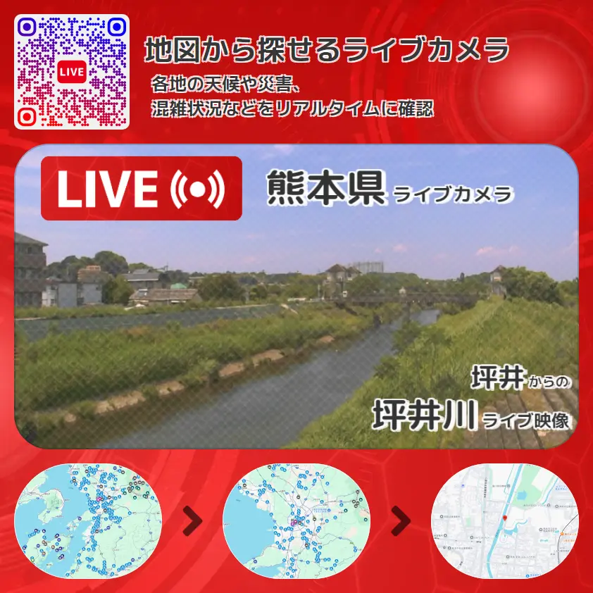 坪井川の他に、永康橋や周辺の気象状況も併せてチェックすることが可能で、台風・大雨・地震などの災害による被害状況も把握することができます。