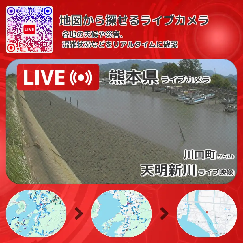 天明新川の他に、緑川天明新川合流地点方面や周辺の気象状況も併せてチェックすることが可能で、台風・大雨・地震などの災害による被害状況も把握することができます。