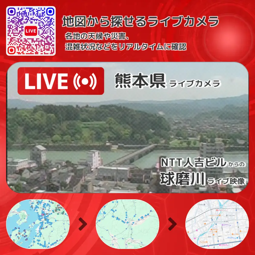 球磨川の他に、水の手橋や周辺の気象状況も併せてチェックすることが可能で、台風・大雨・地震などの災害による被害状況も把握することができます。