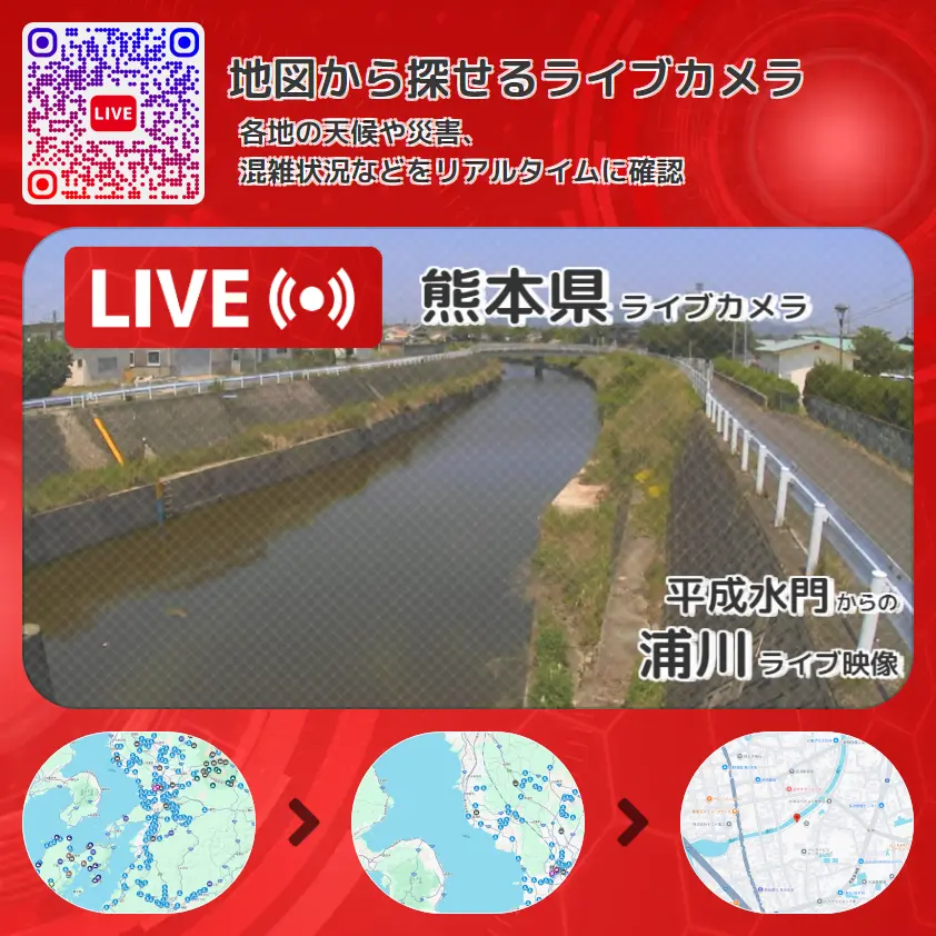 浦川の他に、新川橋や周辺の気象状況も併せてチェックすることが可能で、台風・大雨・地震などの災害による被害状況も把握することができます。