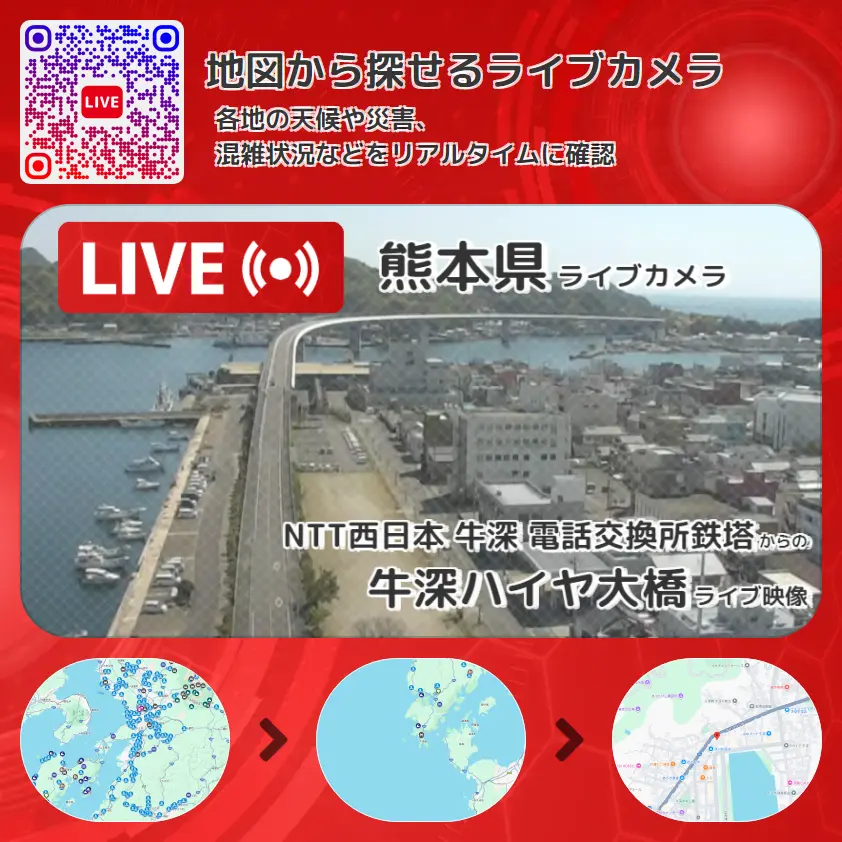 牛深ハイヤ大橋の他に、牛深港や周辺の気象状況も併せてチェックすることが可能で、台風・大雨・地震などの災害による被害状況も把握することができます。