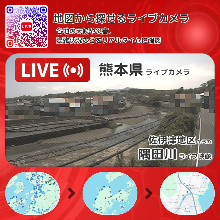 周辺の気象状況も併せてチェックすることが可能で、台風・大雨・地震などの災害による被害状況も把握することができます。