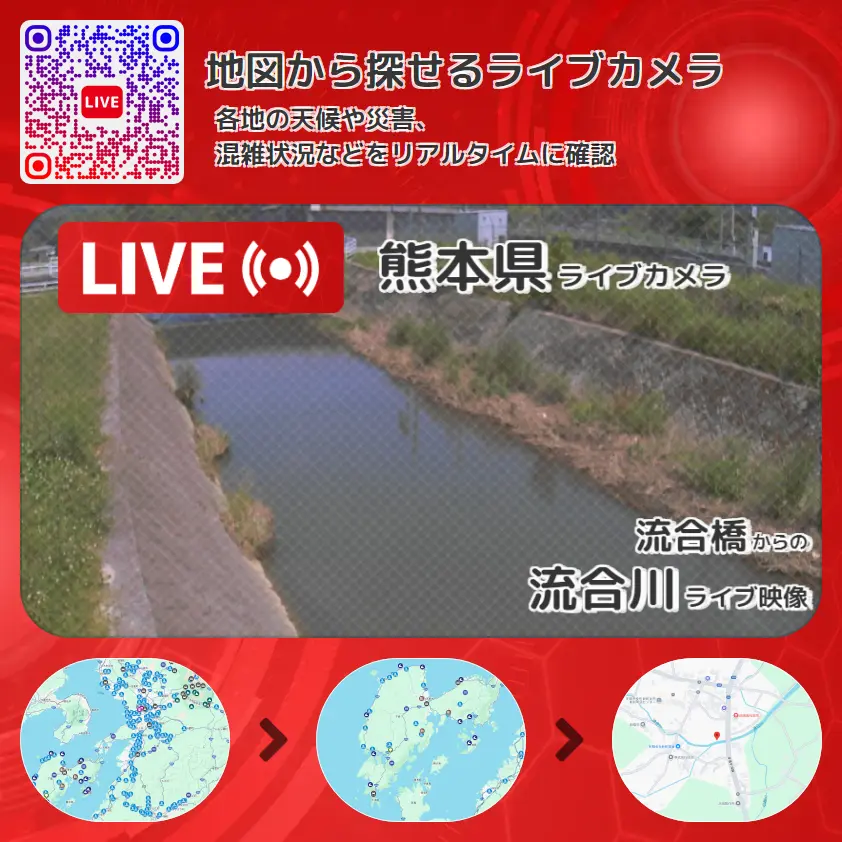 流合川の他に、流合橋や周辺の気象状況も併せてチェックすることが可能で、台風・大雨・地震などの災害による被害状況も把握することができます。