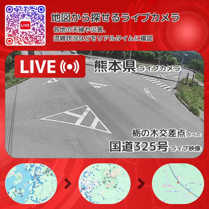 国道325号の他に、熊本県道299号草千里浜栃木線や周辺の気象状況も併せてチェックすることが可能で、台風・大雨・地震などの災害による被害状況も把握することができます。