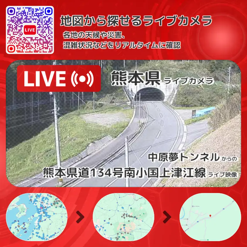 熊本県道134号南小国上津江線の他に、中原夢トンネルや周辺の気象状況も併せてチェックすることが可能で、台風・大雨・地震などの災害による被害状況も把握することができます。