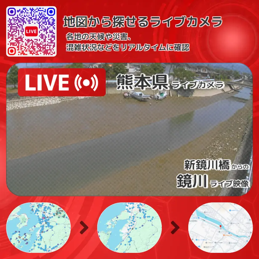 鏡川の他に、新鏡川橋や周辺の気象状況も併せてチェックすることが可能で、台風・大雨・地震などの災害による被害状況も把握することができます。
