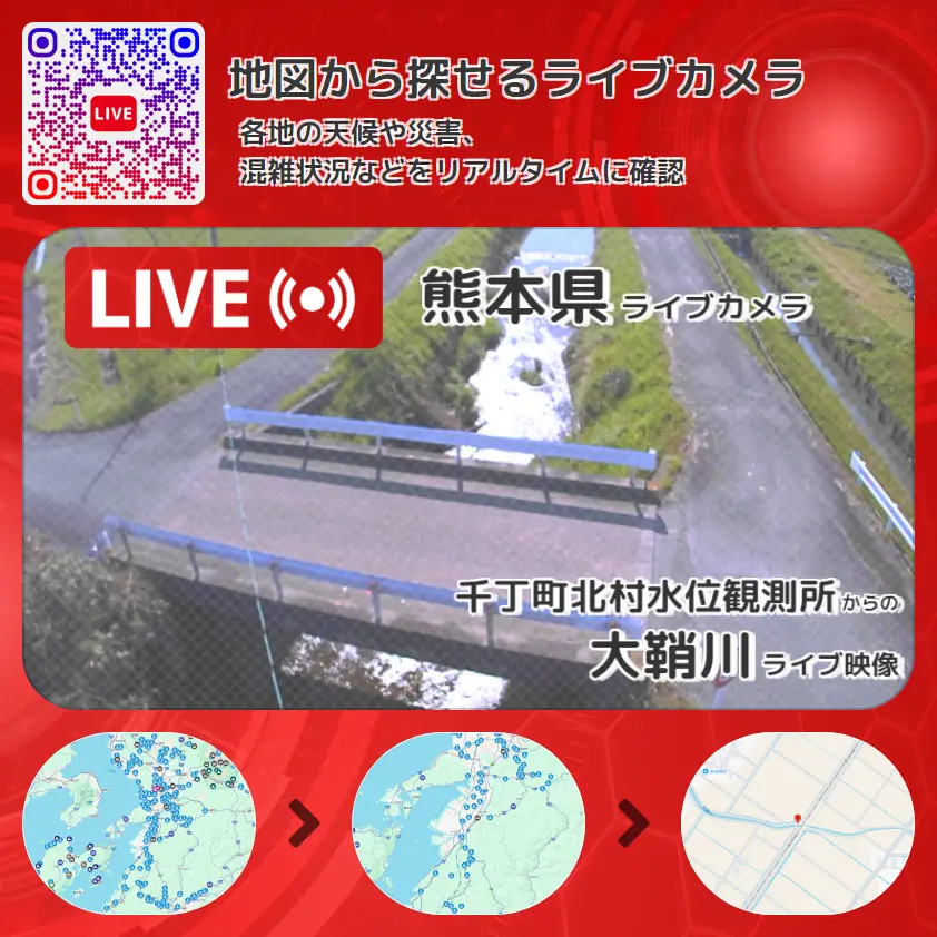 周辺の気象状況も併せてチェックすることが可能で、台風・大雨・地震などの災害による被害状況も把握することができます。