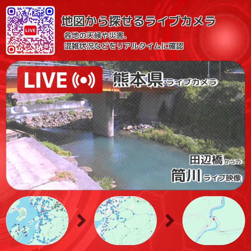 筒川の他に、田辺橋や周辺の気象状況も併せてチェックすることが可能で、台風・大雨・地震などの災害による被害状況も把握することができます。