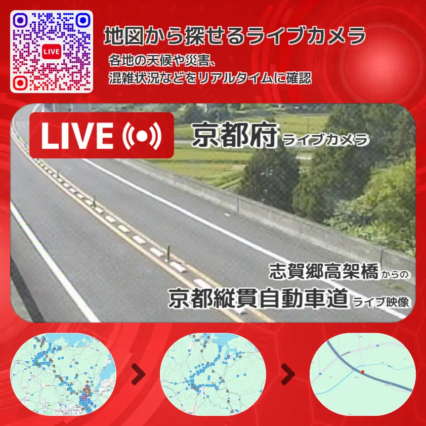 京都縦貫自動車道(丹波綾部道路・国道478号)の他に、志賀郷高架橋や周辺の気象状況も併せてチェックすることが可能で、台風・大雨・地震などの災害による被害状況も把握することができます。