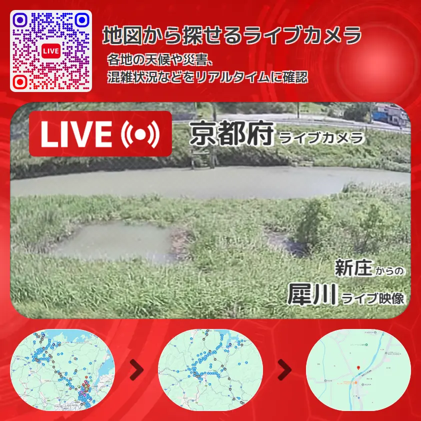 犀川の他に、京都府道9号綾部大江宮津線や周辺の気象状況も併せてチェックすることが可能で、台風・大雨・地震などの災害による被害状況も把握することができます。