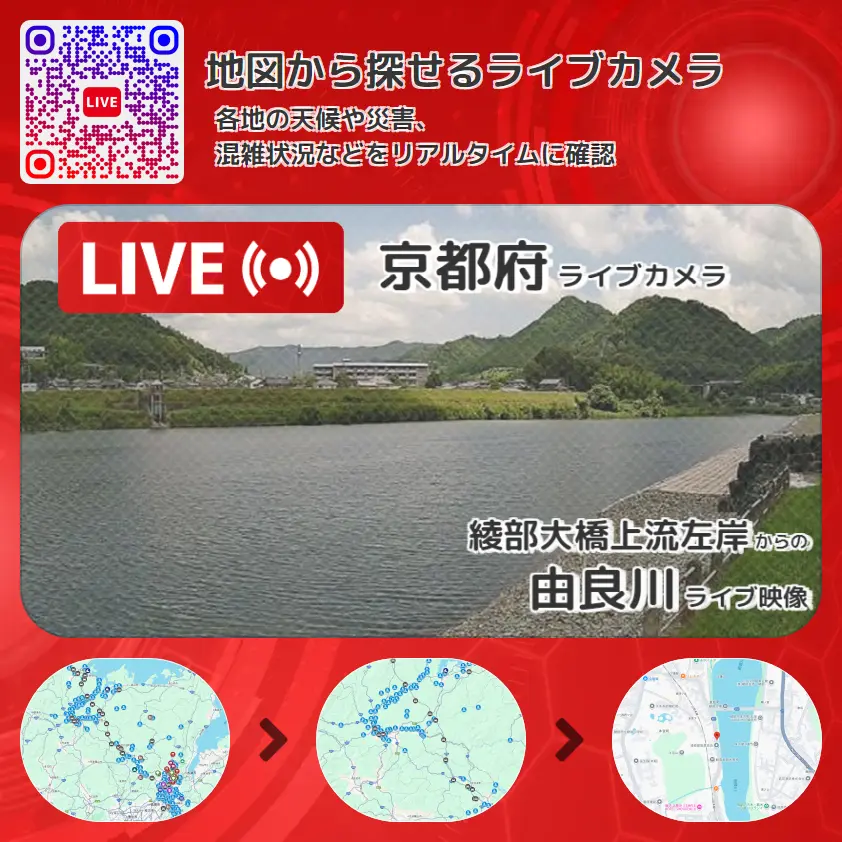 由良川の他に、桜や周辺の気象状況も併せてチェックすることが可能で、台風・大雨・地震などの災害による被害状況も把握することができます。