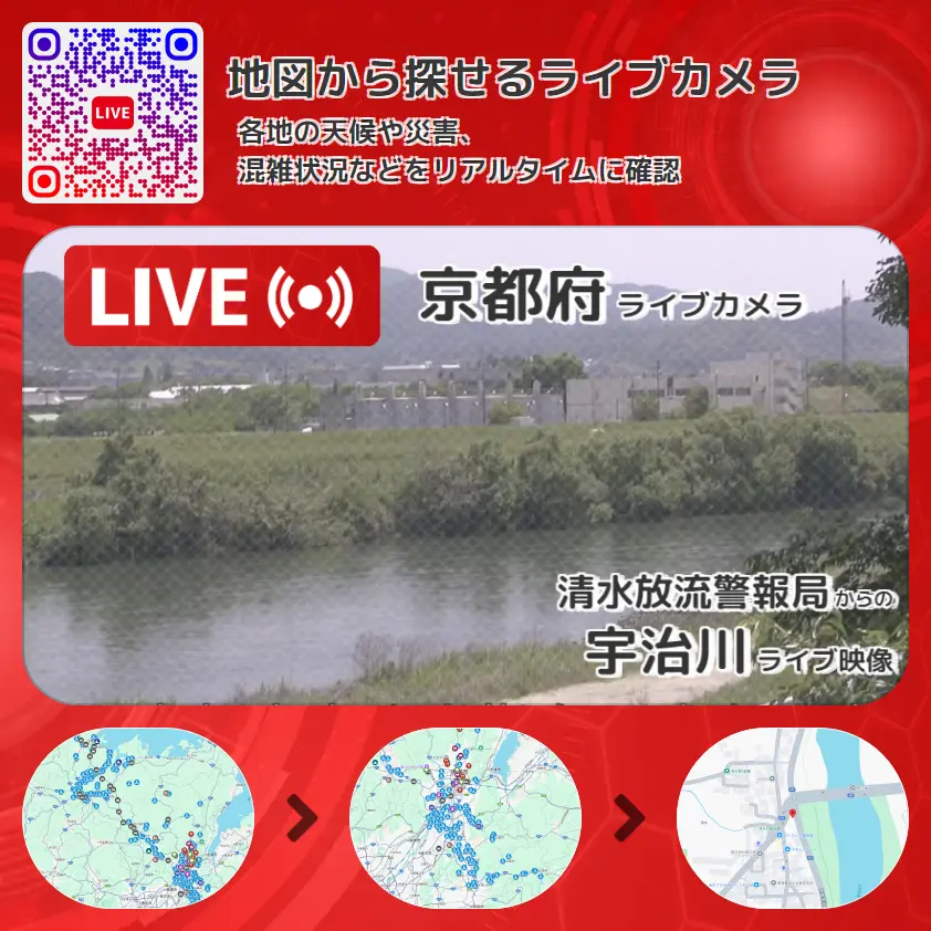 宇治川の他に、隠元橋や周辺の気象状況も併せてチェックすることが可能で、台風・大雨・地震などの災害による被害状況も把握することができます。