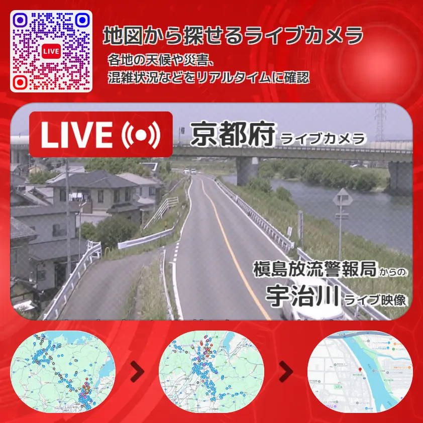 宇治川の他に、京都府道241号向島宇治線や周辺の気象状況も併せてチェックすることが可能で、台風・大雨・地震などの災害による被害状況も把握することができます。