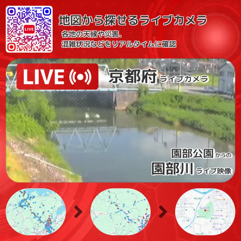園部川の他に、横田橋や周辺の気象状況も併せてチェックすることが可能で、台風・大雨・地震などの災害による被害状況も把握することができます。