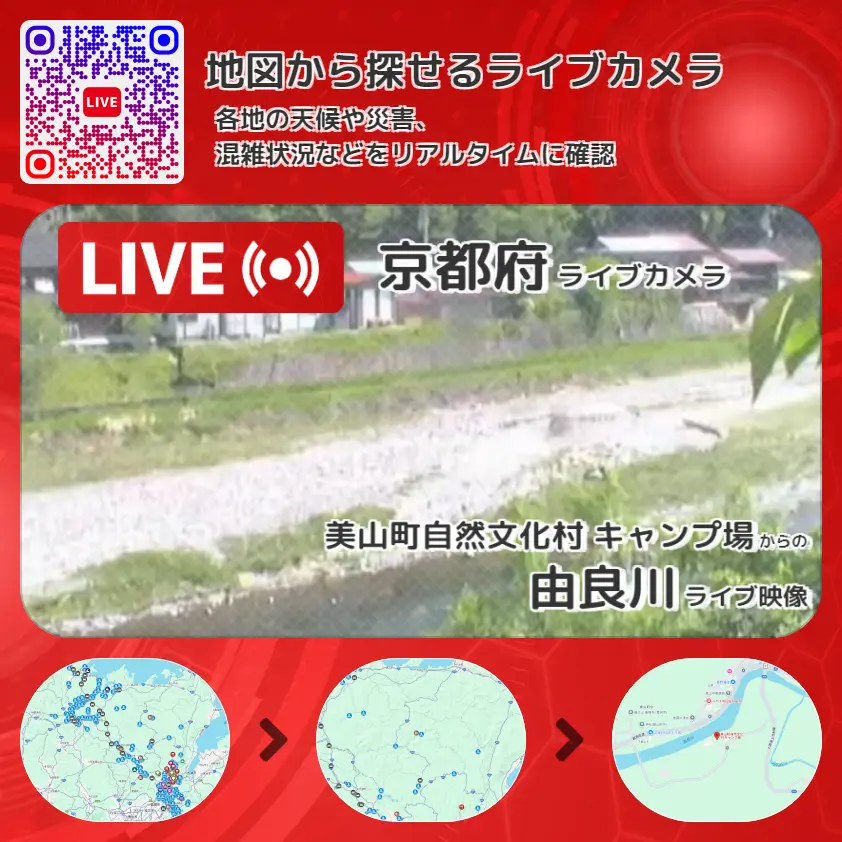 由良川(美山川)の他に、美山町自然文化村や周辺の気象状況も併せてチェックすることが可能で、台風・大雨・地震などの災害による被害状況も把握することができます。