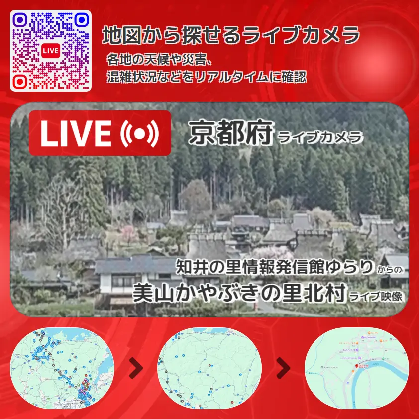 美山かやぶきの里北村の他に、茅葺き屋根や周辺の気象状況も併せてチェックすることが可能で、台風・大雨・地震などの災害による被害状況も把握することができます。