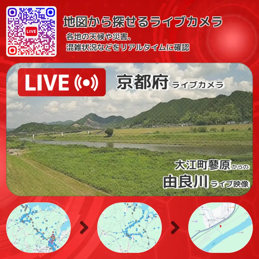 由良川の他に、大江美河橋や周辺の気象状況も併せてチェックすることが可能で、台風・大雨・地震などの災害による被害状況も把握することができます。