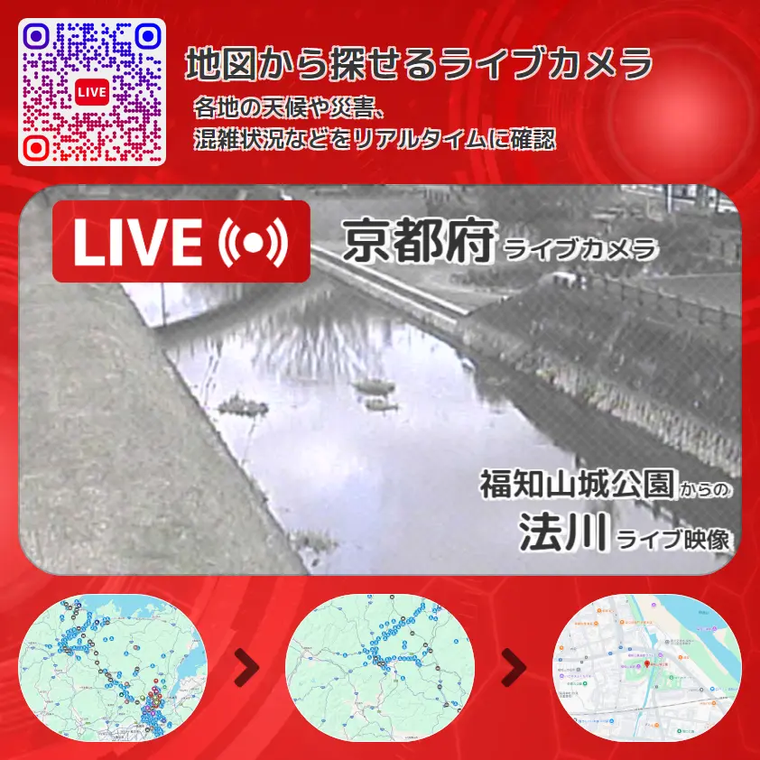 周辺の気象状況も併せてチェックすることが可能で、台風・大雨・地震などの災害による被害状況も把握することができます。