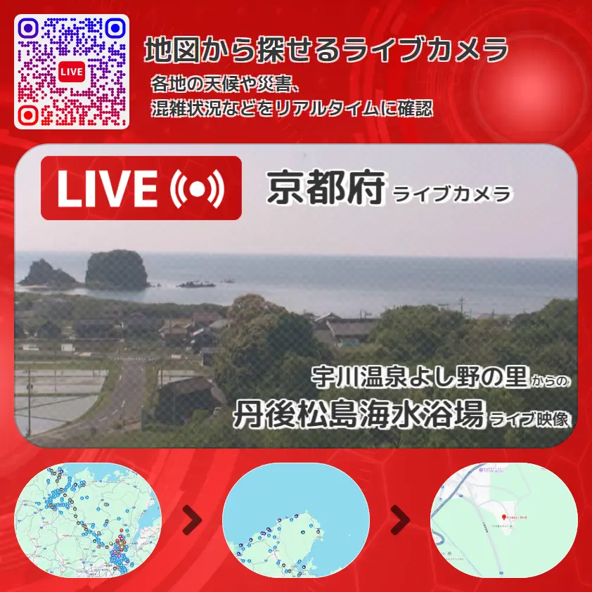 丹後松島海水浴場(平海水浴場)の他に、桜や周辺の気象状況も併せてチェックすることが可能で、台風・大雨・地震などの災害による被害状況も把握することができます。