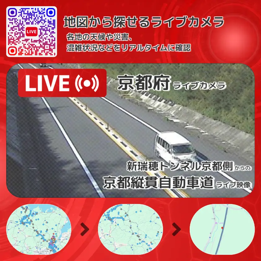京都縦貫自動車道(丹波綾部道路・国道478号)の他に、新瑞穂トンネルや周辺の気象状況も併せてチェックすることが可能で、台風・大雨・地震などの災害による被害状況も把握することができます。