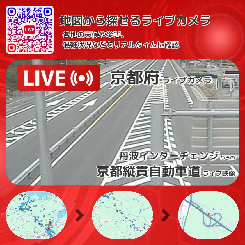京都縦貫自動車道(丹波綾部道路・国道478号)の他に、新須知川橋や周辺の気象状況も併せてチェックすることが可能で、台風・大雨・地震などの災害による被害状況も把握することができます。