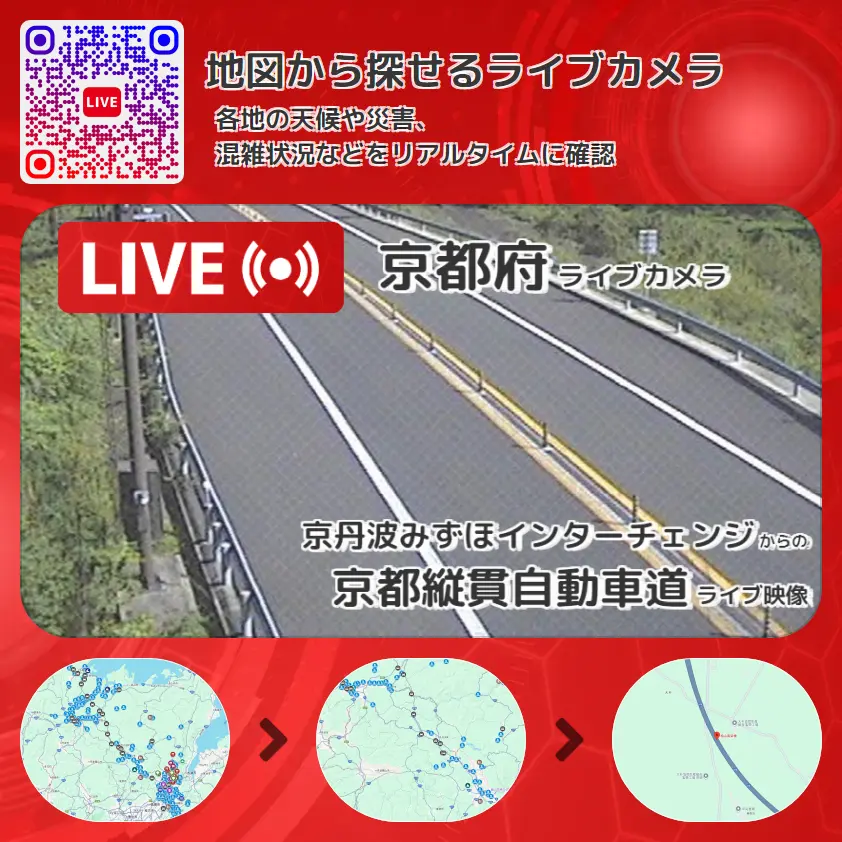 京都縦貫自動車道(丹波綾部道路・国道478号)の他に、桧山高架橋や周辺の気象状況も併せてチェックすることが可能で、台風・大雨・地震などの災害による被害状況も把握することができます。