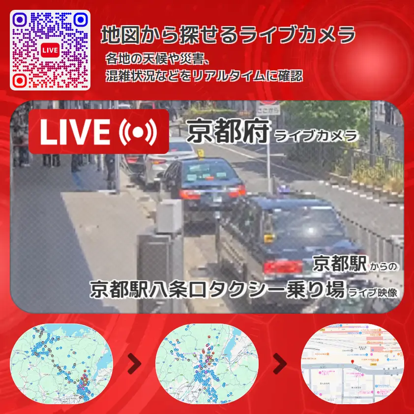 京都駅八条口タクシー乗り場の他に、京都駅八条口や周辺の気象状況も併せてチェックすることが可能で、台風・大雨・地震などの災害による被害状況も把握することができます。