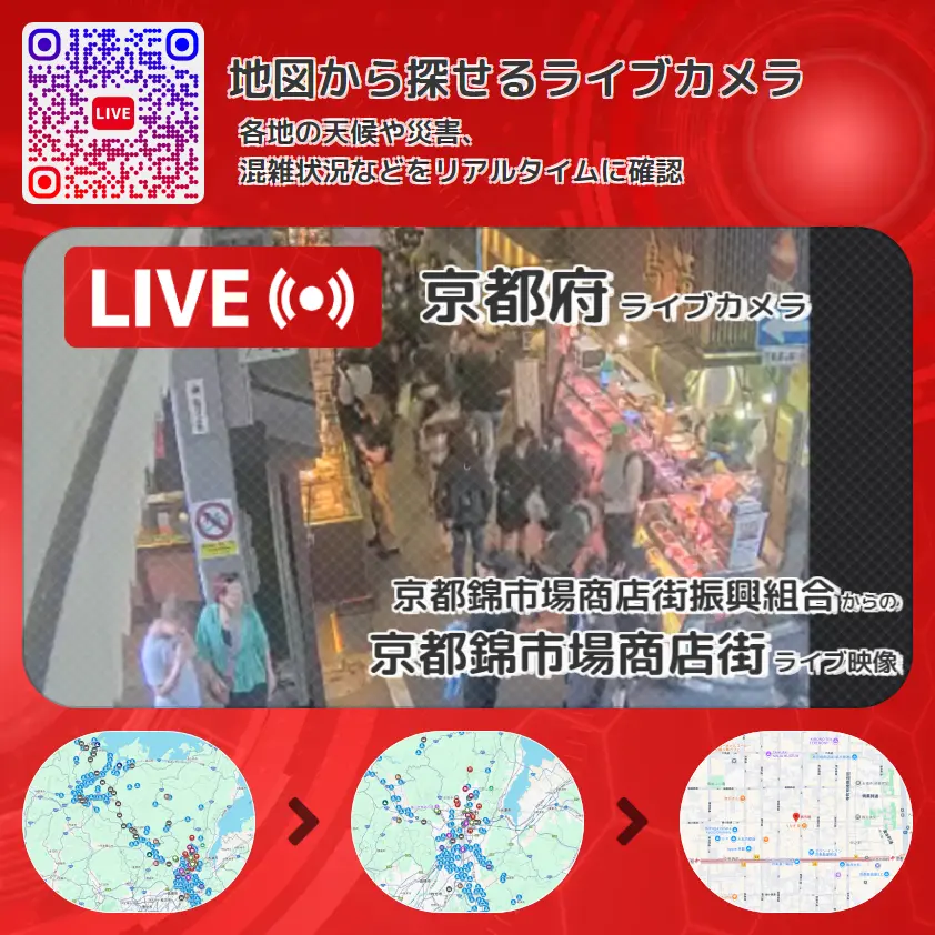 京都錦市場商店街(京の台所)の他に、富小路や周辺の気象状況も併せてチェックすることが可能で、台風・大雨・地震などの災害による被害状況も把握することができます。