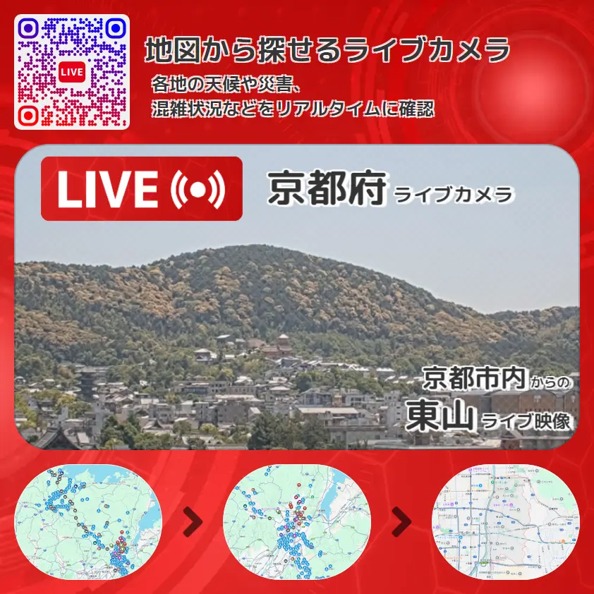 東山の他に、清水寺や周辺の気象状況も併せてチェックすることが可能で、台風・大雨・地震などの災害による被害状況も把握することができます。