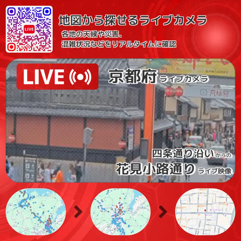 花見小路通りの他に、四条通りや周辺の気象状況も併せてチェックすることが可能で、台風・大雨・地震などの災害による被害状況も把握することができます。