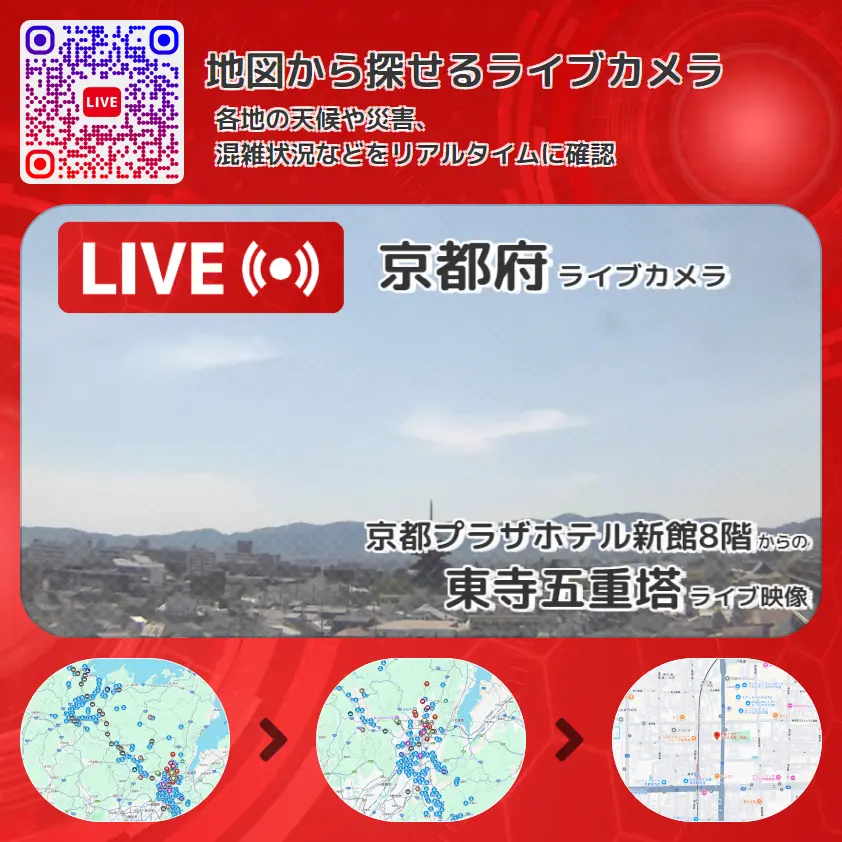東寺五重塔の他に、東寺金堂や周辺の気象状況も併せてチェックすることが可能で、台風・大雨・地震などの災害による被害状況も把握することができます。