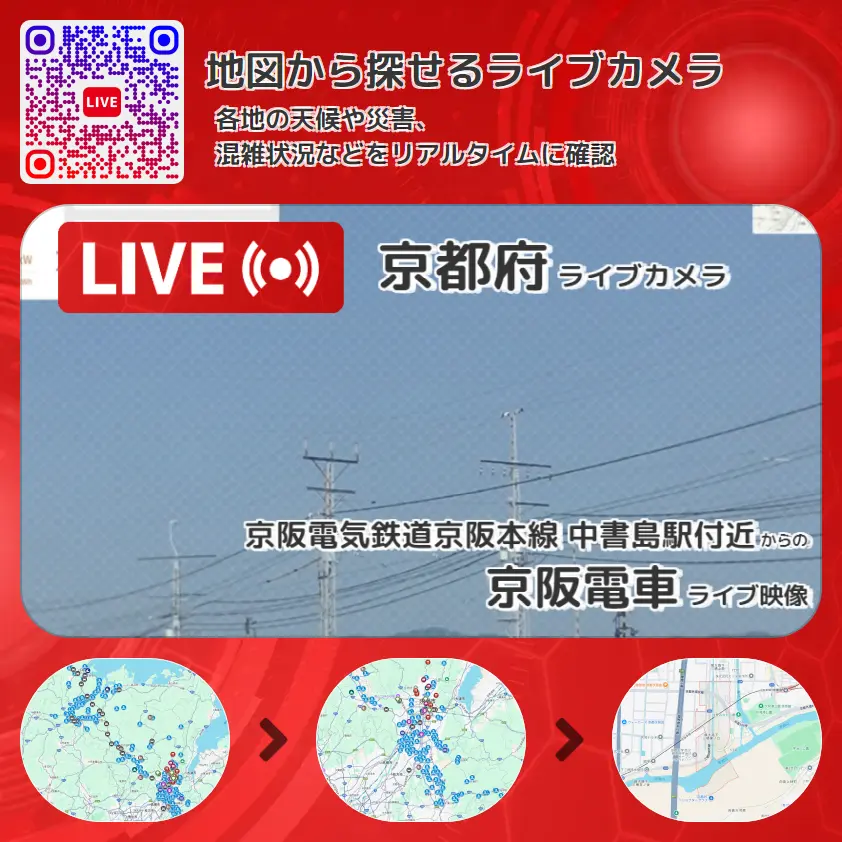 京阪電車の他に、京阪電気鉄道(中書島駅~淀駅間)京阪本線や周辺の気象状況も併せてチェックすることが可能で、台風・大雨・地震などの災害による被害状況も把握することができます。