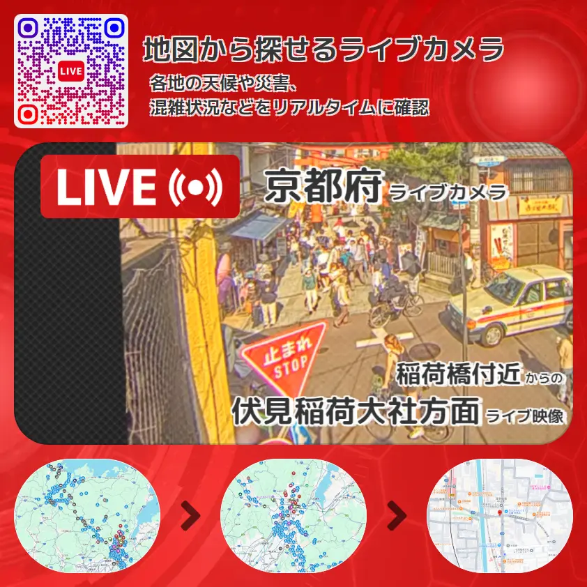 伏見稲荷大社方面の他に、鳥居や周辺の気象状況も併せてチェックすることが可能で、台風・大雨・地震などの災害による被害状況も把握することができます。