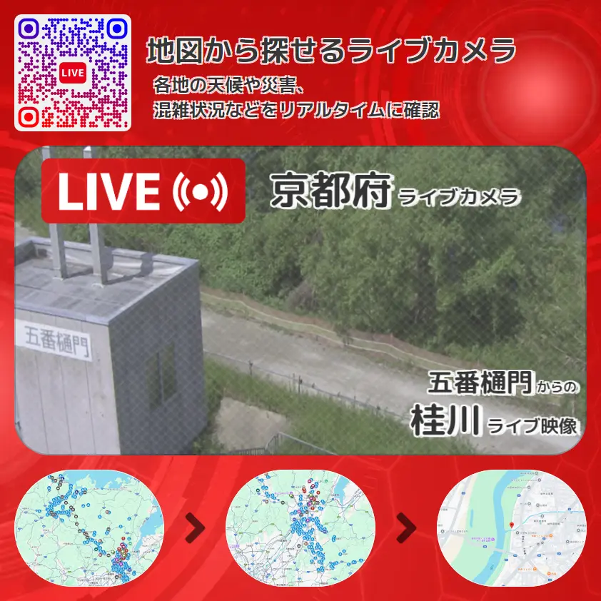 桂川の他に、五番樋門や周辺の気象状況も併せてチェックすることが可能で、台風・大雨・地震などの災害による被害状況も把握することができます。