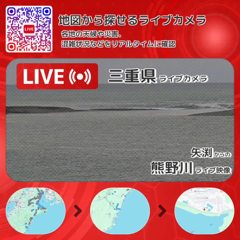 熊野川の他に、熊野川河口や周辺の気象状況も併せてチェックすることが可能で、台風・大雨・地震などの災害による被害状況も把握することができます。